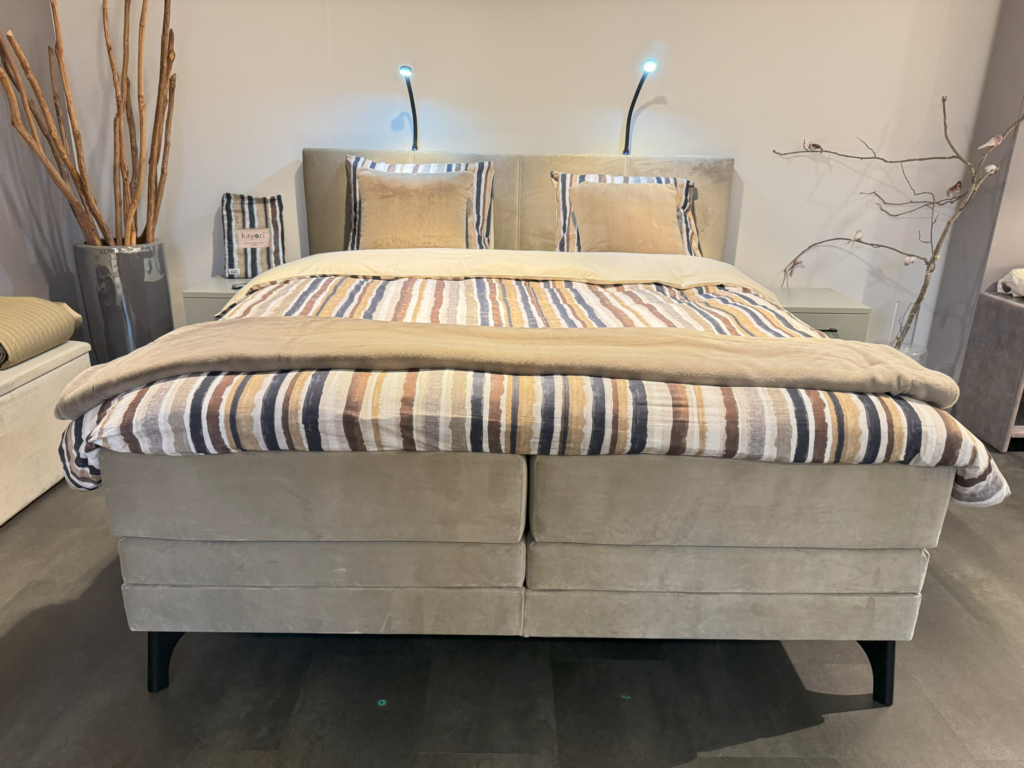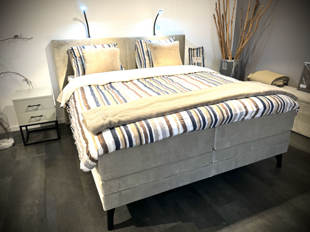 Het hoofdbord steekt aan beide kanten circa 10 cm uit en heeft een hoogte van 120 cm (gemeten vanaf de onderkant van het hoofdbord). Het hoofdbord is gestoffeerd in dezelfde kleur als de boxspring.